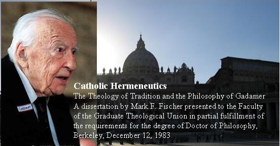 Gadamer’s indirect contribution to the theology of tradition was the explicit topic of my doctoral dissertation. As I look back on it in 2006, however, I realize that the dissertation was more than it explicitly said. It was also an effort to free myself from the illusion, which can be traced back to the Enlightenment, that the individual can be entirely objective and rational. It was an acknowledgement that we human beings are caught up in the currents of history, currents not of our choosing. I realized that, when I “did hermeneutics” as a theologian, I did them as “Catholic hermeneutics,” as an expression of the faith I held and hold. The currents of life bear us along and grant us possibilities and opportunities which, when we accept or reject them, define our lives. The Christian interprets these currents as providence, a gift of God, wherein the relation between humanity and divinity grows. Mark F. Fischer December, 2006